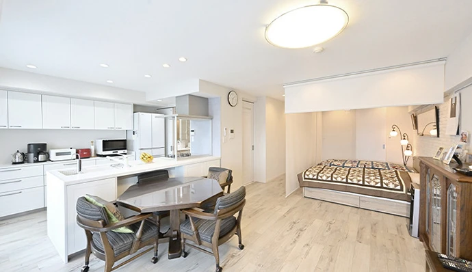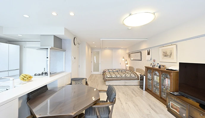 27年前に新築マンションを購入され、こちらにお住まいのKさまご夫妻。定年後のお二人の暮らしをさらに快適にしていこうと、リフォームを決意されました。ご希望は、南側にある暖かいリビング・ダイニングを、ベッドルームも兼ねた大きな一部屋とし、そこを生活の場とすること。そして、収納力のある、明るく風通しのよい住まいとすることも。ご相談をうけて、リビング・ダイニングと以前の洋室(2)を一体にするほか、通風を考慮したウォークインクロゼットの設置や、水回りを機能的にして新たな回遊動線を設けることなどをご提案。さらに、リゾートホテルをイメージした、白を基調とするインテリアのカラーコーディネートも提案し、広々としたワンルーム風のリビングを中心に、自由度高く暮らせるお住まいが完成しました。