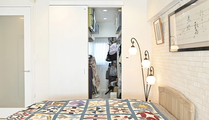 ベッドスペースの隣は、奥さまのウォークインクロゼット。窓があるので中は明るく、さらに窓を開けると、リビング・ダイニングから心地よい風が通り抜けていきます。