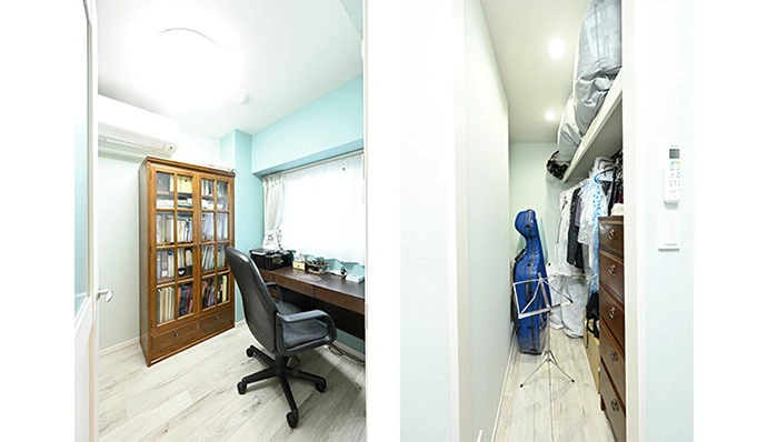 洋室(2)は、旦那さまの書斎兼仕事場。気持ちを落ち着ける効果があるブルーのクロスを採用しました。併設のウォークインクロゼットは、趣味の品や洋服の収納に十分なスペースを確保しました。