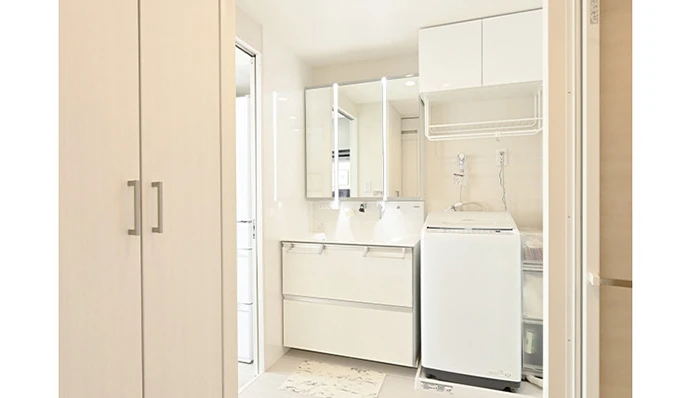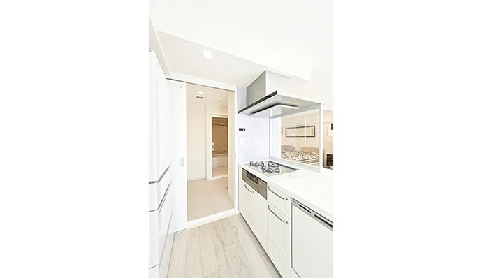 キッチンからリビング・ダイニングを通らずに、洗面室、浴室へ行ける新たな回遊動線を提案。動きやすく、着替えなどの使いやすさも向上した動線をつくることができました。