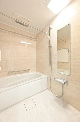 浴室は、ワンサイズ大きな1317サイズに変更し、さらにゆったりと入浴できるようになりました。大理石調のアクセントパネルが、ナチュラルでやさしい雰囲気を演出しています。