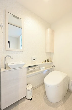 狭くてお困りだったトイレは、奥行きを広げ、大きく開く引き戸に変更。さらに手洗い器付きのカウンターも設置して、使い勝手を向上させました。