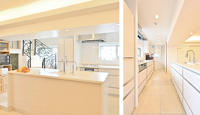 新設したアイランドキッチンからは、リビング・ダイニングが一望できるようになりました。白を基調にした明るいキッチンは、天板をクォーツストーンに、床はタイルにして手入れのしやすさにもこだわりました。収納スペースとして使えるようにキッチン奥にはカウンターも造作。
