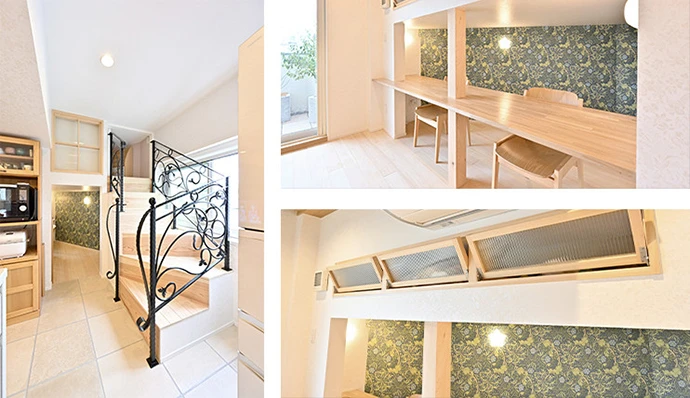 お子さまの遊び場として使える階段つきのロフトを新設。ロフト下には長いカウンターを設置して、ワークスペースやお子さまの学習デスクなど幅広く活用できるようにしました。アイアンのデザイン手すりや花柄のアクセントクロス、ロフトの小窓がおしゃれなポイントになっています。