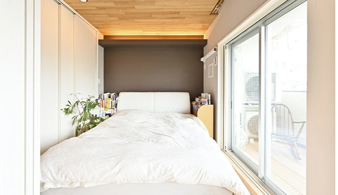 寝室は、就寝時に照明の灯りが顔に直接当たらないように間接照明や角度調整ができるユニバーサルダウンライトを採用。グレーのアクセントクロスも相まって落ち着いた空間になりました。壁一面に大きなクロゼットを設けて、収納を集約できるようにしました。