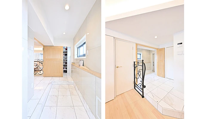 玄関は、天然大理石のタイルや重厚感のある大きな扉を採用して戸建ての玄関をイメージ。スペースを広くとることで、ご家族3人で順番待ちせず靴の脱ぎ履きが可能になりました。また、ウォークスルータイプの玄関収納にして、回遊性も使い勝手も向上しました。