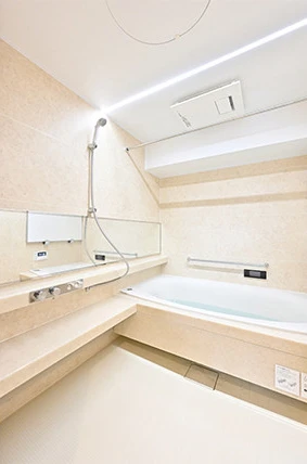 浴槽、洗い場ともに、ご家族3人で広々と使えるようサイズアップ。横長の鏡がより広さを強調しています。お子さまのために、保温力が高く湯冷めしにくいユニットバスを採用しました。