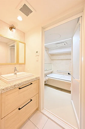 洗面室は、ベージュのタイルと木の柔らかな雰囲気でおしゃれな空間に。造作した鏡面収納を壁に埋め込んでスペースも確保。床には、冷たさを感じにくい機能のあるタイルを採用しました。