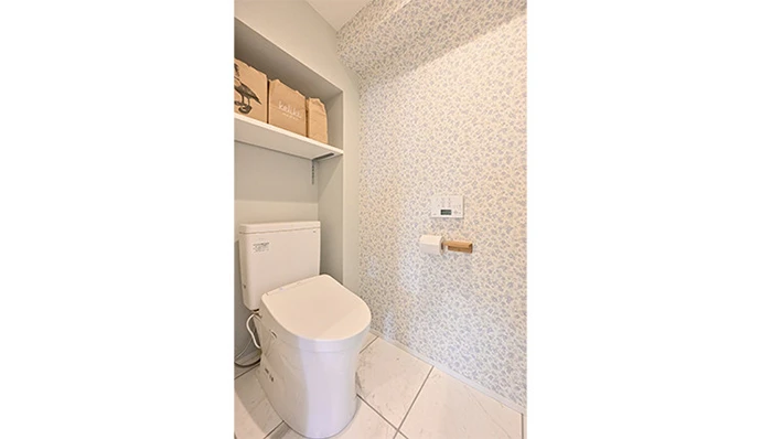 トイレの床は玄関と合わせて天然大理石に。ブルーの花柄のクロスが爽やかな印象です。