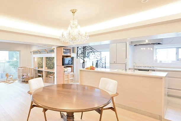 転勤を機に引越しが決まったOさまご夫妻は、スケルトンリフォームを前提に築54年の中古マンションをご購入されました。リフォームでは、全体を見渡せるオープンなリビング・ダイニング・キッチンに加え、浴室、玄関を広くして、ご家族3人がいつも一緒に過ごせるような住まいをご要望されていました。Oさまご夫妻のご希望に合わせて、まずは各居室の壁を取り払い、広いリビング・ダイニングを住戸の中心に配し、家族がどこにいても気配を感じられるようにしました。さらに、水回りの位置を変えることで浴室やトイレを広く配するプランをご提案。ご家族が仲良くいつも一緒にいられる、明るく広々とした開放的な空間が実現しました。