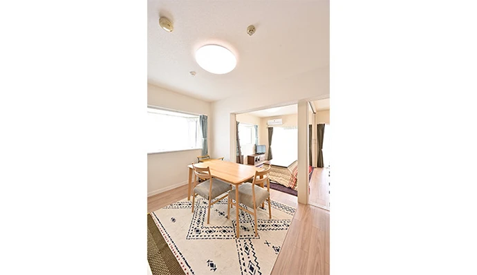 ダイニング・キッチンのクッションフロアと、リビングのカーペットをフローリングに張り替えることで、ダイニング・キッチン、リビングが一続きになりました。