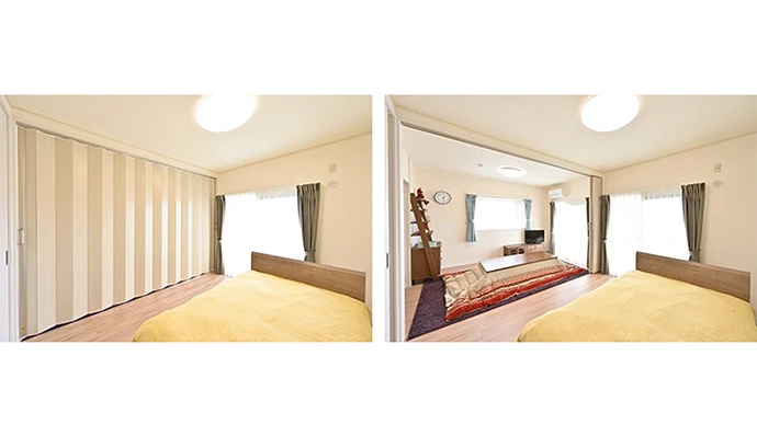 奥さまの寝室として使用する洋室(1)は、和室をフローリングにし、リビング側の壁を撤去してアコーディオンカーテンを設置することで、開けるとリビングの窓から気持ちの良い眺望が楽しめるようになりました。