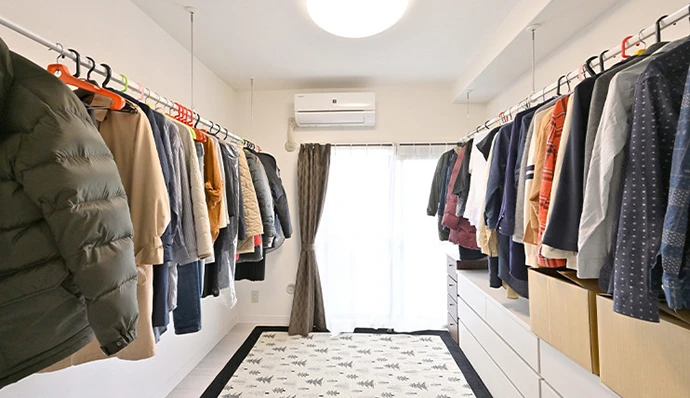 洋室(2)には、両側の壁面にホスクリーン(室内用物干し)を新設して衣類を掛けられるように設えました。