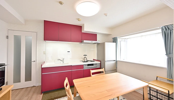 キッチンは最新設備に一新。白を基調としたインテリアのアクセントになるよう、カラーは赤を採用しました。