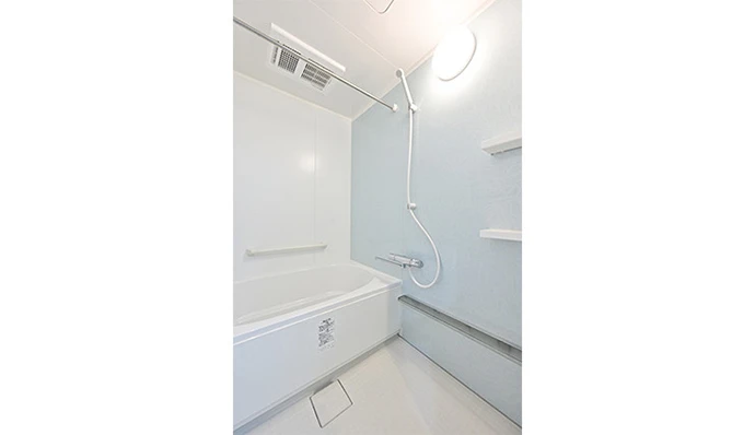 浴室は最新のユニットバスに変更。床材は乾きやすいタイルを採用して手入れがしやすくなりました。また、洗面室と浴室の段差をなくしてフラットにしました。