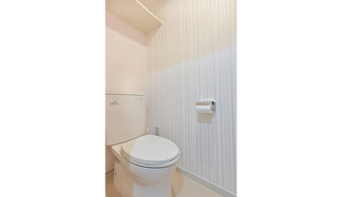 トイレはクロスを張り替えました。ピンクベージュのストライプを採用してやさしい雰囲気に。