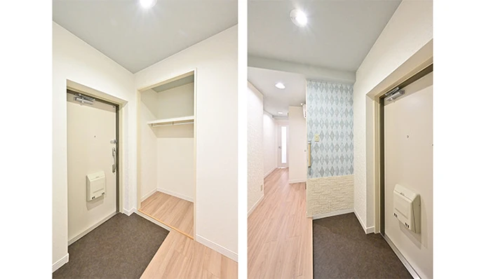 玄関は、玄関収納を撤去して広いスペースを確保。玄関に隣接する物入れに新たにハンガーパイプを設置し、上着などもしまえるようになりました。また、ブルーのクロスと、玄関の湿気を抑えるためのエコカラット※1をアクセントとして施しました。さらに将来を見据え、手すりも新設しました。