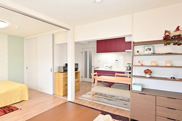 27年前に中古でマンションを購入されたSさまご夫婦は、ご自宅で過ごす時間が増えたことから、カーペットや水回り設備の劣化が目につくようになりリフォームをご決断。最新の水回り設備への変更と、明るく開放感のある住まいをご希望されました。まずは、全室フローリングに張り替え、和室を洋室(1)に変更。リビングとの間の壁を撤去し、ご夫婦の思い入れのある柱は残したまま、開閉可能なアコーディオンカーテンを設置することで開けるとダイニング・キッチン、リビングと一続きになった明るく広い空間に。また、キッチンやクロスは、ご夫婦それぞれのお好みのカラーにこだわりインテリアも楽しめる住まいが完成しました。