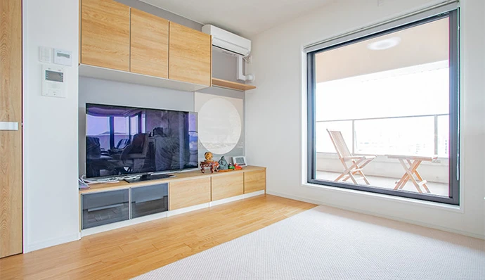 広くなったリビング・ダイニングの一角には、テレビボードと棚、吊戸棚を新たに設置しました。