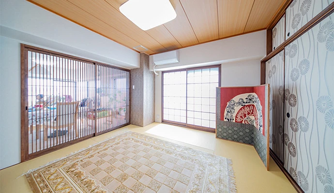 リビング・ダイニングと隣接した和室は、建具を格子の引き戸に替えました。格子にすることでリビング・ダイニングからの光も入り、建具を閉めても明るいお部屋となりました。襖や屏風の模様、格子戸といった和の雰囲気に合わせ、柱の表面にも縦模様の羽目板を採用しました。