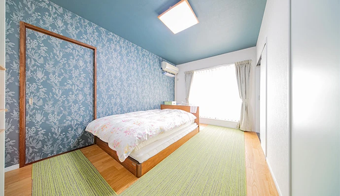 寝室として使う洋室(1)、和室との間に引き戸を新設することで、廊下を通らなくてもリビング・ダイニングに行ける動線を確保しました。床の一部にはフロアマットを敷き、足の滑りを抑えるよう配慮しました。天井と草模様のクロスの色には、ブルーをアクセントとして採用しました。