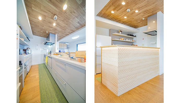 独立型だったキッチンは対面式にして開放感を高め、最新のシステムキッチンを採用しました。システムキッチン背面のスペースには、食器棚を新たに設え、収納スペースは格段に増えました。また、キッチンの天井には木目調の化粧板、システムキッチンのリビング・ダイニング側には木製の化粧板を採用し、ナチュラルで暖かみのある空間としました。