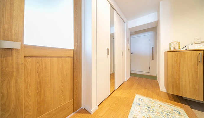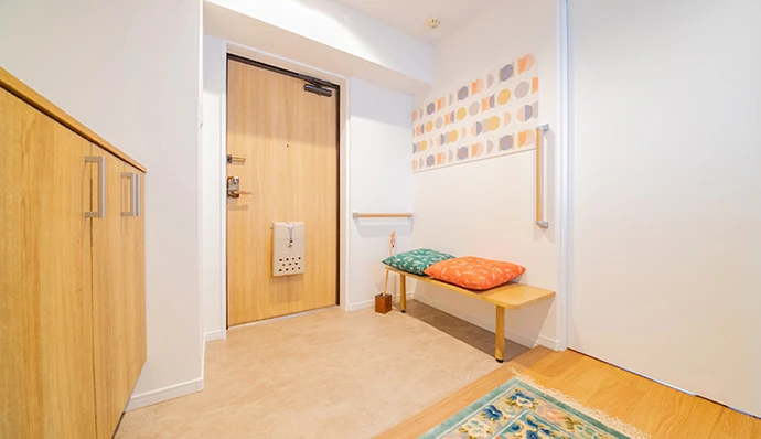 玄関は、2カ所あった玄関収納を1カ所にし、座って靴の脱ぎ履きなどができる木製ベンチを造作しました。また、立ったり座ったりといった動作がしやすいよう、手すりも新設しました。白一色の壁面が視覚的に単調にならないよう、アクセントとしてエコカラット※1を設置しています。