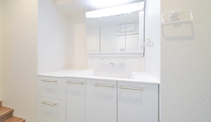 洗面室をより広く使えるよう、洗面化粧台の位置を変更し、新しく大きな洗面化粧台に替えました。カウンターが広くなり、使い勝手も向上しました。