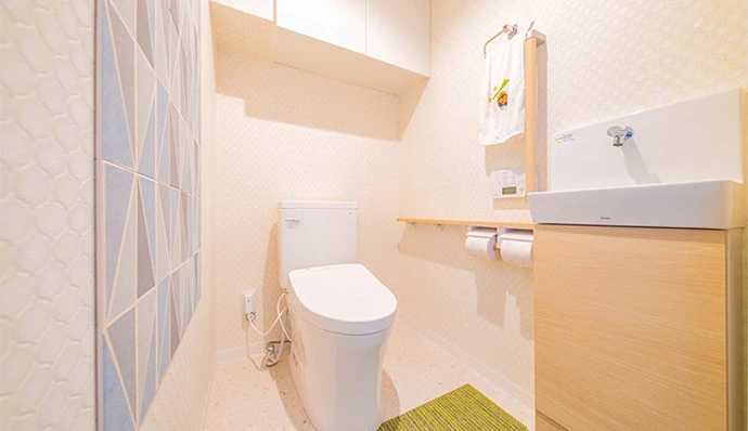 トイレは最新の設備に交換し、手洗い器、カウンター、手すり、を新設して使い勝手を向上させました。また幾何学模様のエコカラット※1も設置しました。トイレスペースは幅、奥行ともに広げ、トイレ内の動作がしやすいように、扉を内開きから外開きに変更しました。