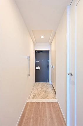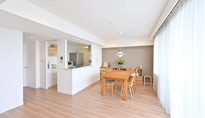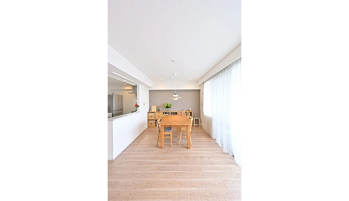 リビング・ダイニングの天井と壁は白のクロスに、フローリングは明るくナチュラルな色の床材に上張りしました。ガラスの大きな明かり取りがあるドアを採用し、廊下にも光が入るよう配慮しています。また、リビング側の壁には、薄いグレーのエコカラット※1を採用し、上品な風合いのあるアクセントとしました。