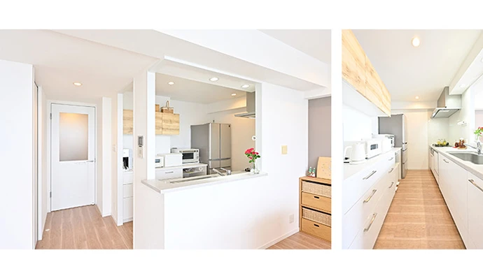 シンクの上にあった吊戸棚をなくし、明るく開放的なキッチンとしました。洗面室につながるキッチン背面の引き戸をなくし、壁に変更したことで、食器棚を置けるスペースが増え、新たに造作した食器棚と合わせ、収納力がアップしています。キッチンは既存の面材を白い面材に交換しました。