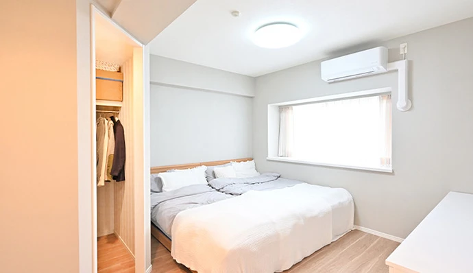 ご家族でおやすみになる洋室(1)のクロスは、薄いグレーで落ち着いた雰囲気に。ウォークインクロゼットは、従来あったドアをなくすことで、出し入れしやすく内部に空気がこもらないようにしました。