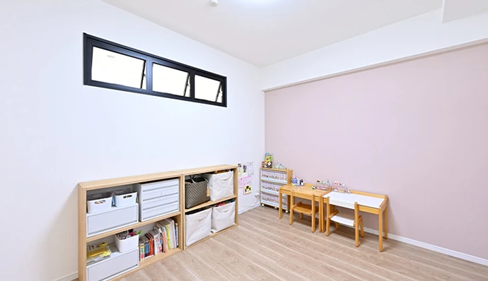 お子さまの部屋として使用する納戸は、ピンク色のアクセントクロスを使い、独立した子ども部屋としてリフォーム。リビング・ダイニング側の可動間仕切りを壁に変更して、将来、成長されたお子さまが個室として使いやすいようにしました。さらに、採光・換気を考慮して、壁の上部に開閉できる室内窓を取り付けています。室内窓のカラーはブラックを採用し、インテリアのアクセントとしました。