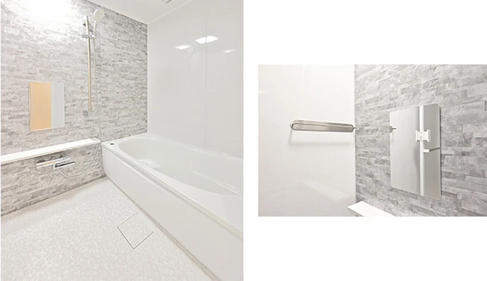 浴室は、半身浴のしやすい肘が置けるタイプの浴槽を備えた、最新のユニットバスに交換し、アクセントとして石目調のパネルを採用しました。鏡やタオル掛けは、壁から取り外せるマグネットタイプとすることで、お手入れが簡単になりました。
