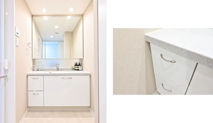 傷みが少なかった洗面化粧台は、既存のものを流用。扉を白い面材に交換し、取っ手も優美な曲線を描くデザイン性の高いものに変更しました。床は、落ち着いた色合いのクッションフロアを上張りしています。