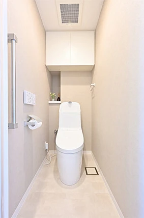 トイレは、最新の設備に交換。洗面室と同様に落ち着いた色合いのクッションフロアとし、視覚的に単調にならないようデザインしました。