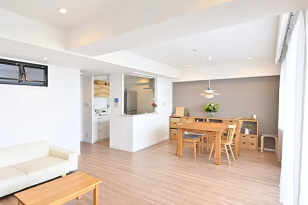 オーナーのHさまは、ご夫妻と二人のお子さまの4人家族。ご主人の在宅ワークに使う部屋が必要となり、これまでお住まいのマンションでは手狭となったことから、広さと間取りの良さが気に入った、こちらのマンションを購入されました。そして、ご入居前に、独立した子ども部屋を確保し、明るく開放的なキッチンにするリフォームをご希望されました。また、以前のお住まい同様、白を基調としたインテリアで、明るくナチュラルな雰囲気にしたいとのことでした。住みやすさを考慮しながら、隅々までコーディネートの行き届いた素敵なお住まいができました。