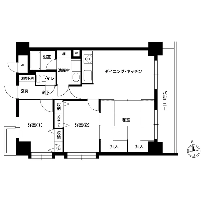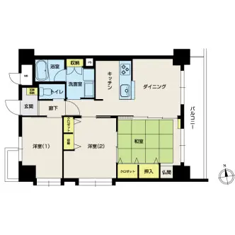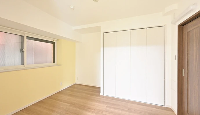 洋室(2)は洋室(1)の収納スペースを使って居室のスペースを広げお嬢さまのお部屋として使用できるようにしました。黄色のアクセントクロスで明るい雰囲気に。