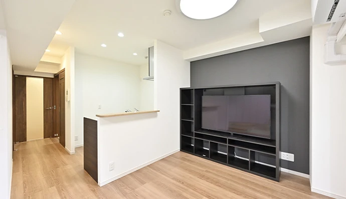 ダイニングの空間を広く感じられるよう、廊下との間の扉を玄関側に位置を移動させました。壁面はグレーのアクセントクロスを採用し、スタイリッシュな雰囲気に。