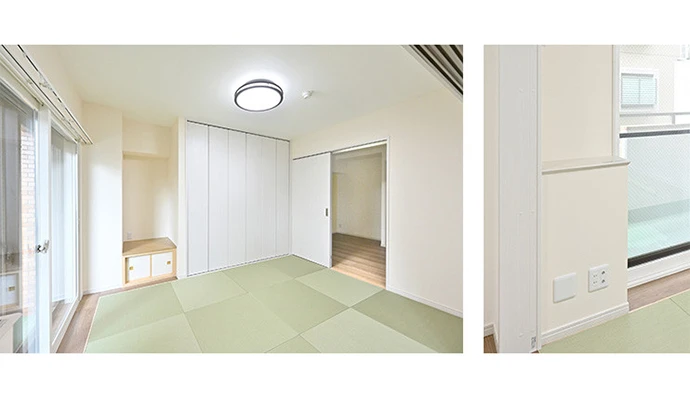 Mさまの寝室として使用する和室は琉球畳を採用しモダンな雰囲気に。板の間を採用したことで洋室とダイニングにつながりを持たせています。押入れはクロゼットに変更し洋服を掛けるためにハンガーパイプを設け、布団も入れられるよう奥行きを考慮して造作しました。また、仏壇のサイズに合わせた棚、お気に入りの物を飾ることができる造作のカウンターも新設しました。