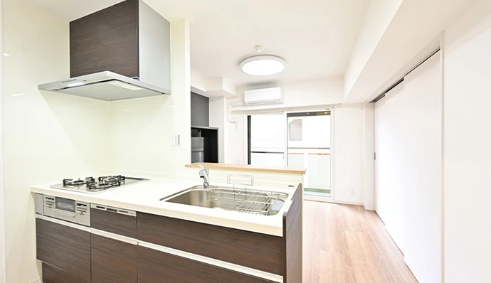 キッチンは、壁付きのタイプから対面式のオープンキッチンへと変更しました。ダイニングにいるご家族との会話も楽しめる、使い勝手のよいキッチンへと変わりました。