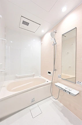 浴室は最新の設備に変更。ボタンが大きく操作がしやすい水栓を採用しました。ピンクのアクセントパネルを採用し優しい雰囲気の浴室に仕上がりました。