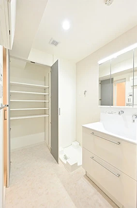 洗面化粧台は一面鏡から三面鏡のタイプに交換。収納量も増えました。また洗面室の収納は可能棚に変更し、入れるものに合わせて高さを変更できるようになりました。