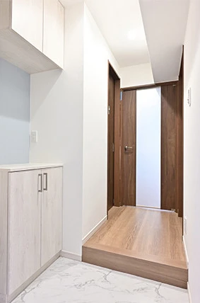 玄関から廊下のみ高さを上げることで居室の段差を全て解消しました。梁があり暗さがお悩みだった玄関と廊下はダウンライトを増設し明るい空間になりました。水色のアクセントクロスは風水で良いとされているカラーをお選びになりました。