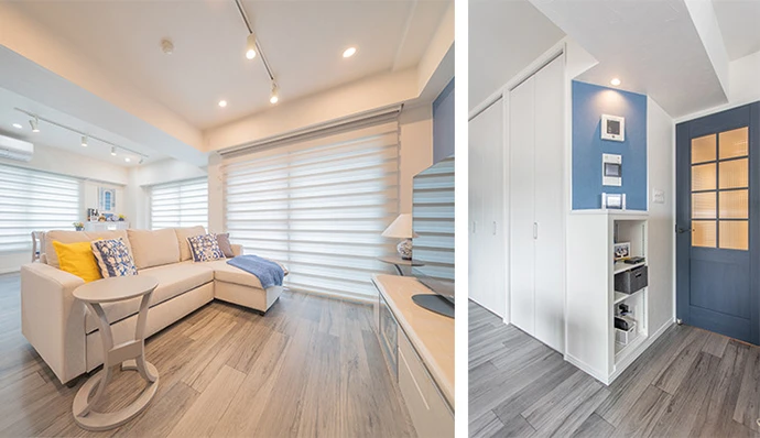 築27年のマンションを本邸とセカンドハウス、2部屋所有されているNさま。以前旅行されたポルトガルが気に入り、セカンドハウスとして使用しているお部屋を、ポルトガルにいるような非日常の癒しを感じられる空間にしたいとご希望されていました。そこでお客さまの思い入れのあるポルトガル風の内装をご提案。また、収納計画を見直したことで室内に収納家具を置く必要がなくなり、空間にゆとりが生まれました。ポルトガルにいるような雰囲気を醸し出す内装デザインの部屋となり、非日常を感じられるすっきりとした住まいが完成しました。