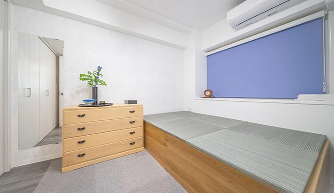 洋室(1)はお子さまのご家族が帰省された際や、来客の際に利用できるようゲストルームとしました。クロゼットは収納するお持ちの物に合わせて収納スペースを拡張。ロールスクリーンはポルトガルのインテリアデザインを取り入れブルーを採用しました。
