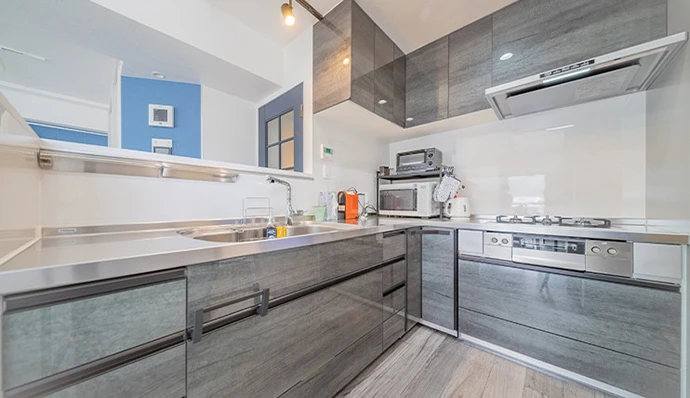 キッチンは対面キッチンからL型キッチンへ変更しました。調理スペースが広くなり、お料理の際の動線がスムーズになりました。面材はフローリングの色と合わせ木目のデザインを採用しました。