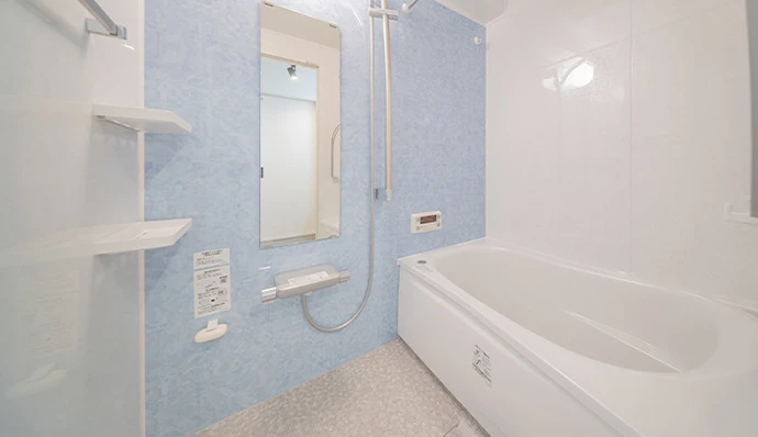 浴室は最新の設備に変更。ブルーのアクセントパネルを採用し、爽やかな雰囲気になりました。