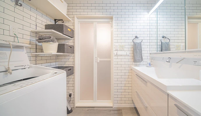 洗面室はスペースを広げることでゆとりのある空間に。洗面化粧台は一面鏡から三面鏡のタイプに交換し収納量も増えました。洗濯機置き場の横に可動棚を新たに設け、リネン類を収納する際、高さを変えられるようにしました。