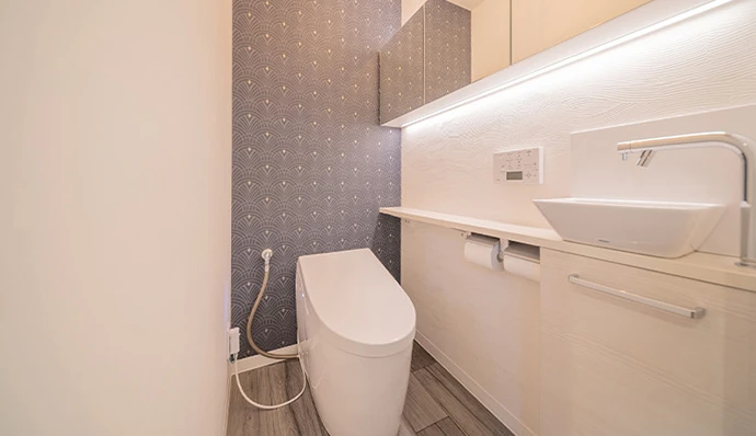 トイレはタンクレストイレに変更。新たにミラー付きキャビネットを採用し、空間が広く感じられるようになりました。